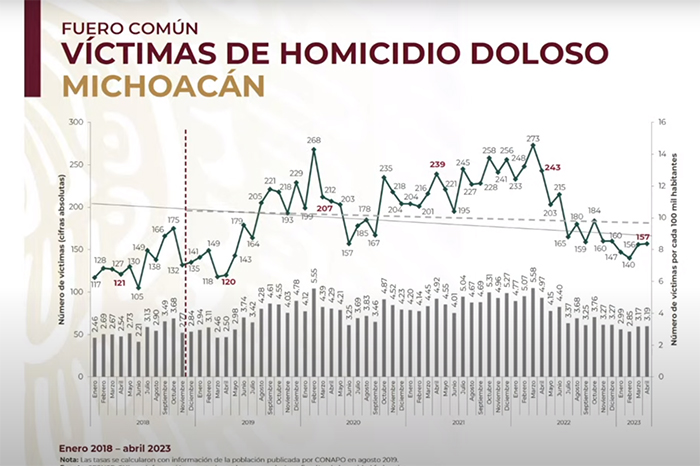 La mañana de este día, en la conferencia de prensa matutina llevada a cabo en el Palacio Nacional, la titular de la Secretaría de Seguridad y Protección Ciudadana (SSPC), Rosa Icela Rodríguez Velázquez, compartió las estadísticas de este delito correspondientes al cierre del mes de abril, donde Michoacán sigue con la reducción de este ilícito.