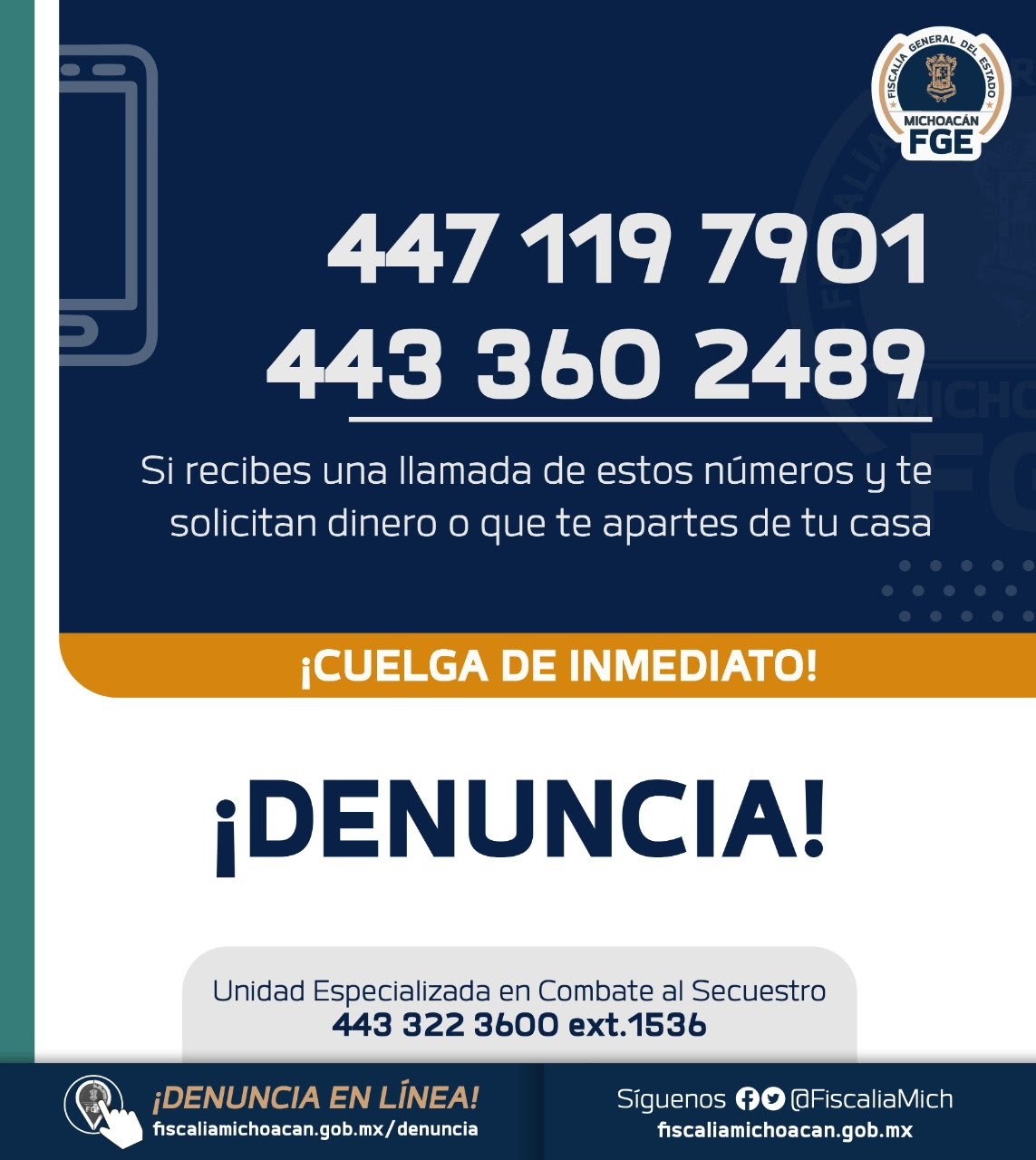 La FGE solicita a la población a no atender este tipo de llamadas y denunciarlas de forma inmediata ante la Fiscalía Regional más cercana, o bien a la Unidad Especializada de Combate al Secuestro, ubicada en Periférico Independencia #5000, colonia Sentimientos de la Nación en Morelia, o comunicarse al teléfono 443 322 36 00 extensión 2234.