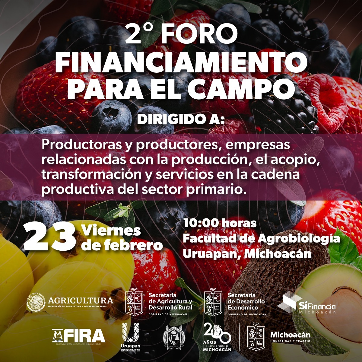 Morelia, Michoacán, 19 de febrero de 2024.- El viernes 23 de febrero se llevará a cabo en Uruapan la segunda Feria de Financiamiento para el Campo, dirigido a productoras y productores, así como a empresas dedicadas a la producción, acopio, transformación y servicios en la cadena productiva del sector primario.