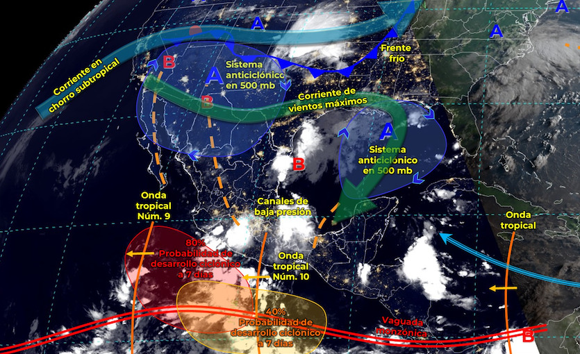 Lo anterior advierte una alta probabilidad para desarrollo ciclónico, tras la presencia de la onda tropical número 9, la cual se localiza al sur de las costas de Colima y Michoacán, así como por el desplazamiento de la onda tropical número 10 sobre el centro y sur del territorio nacional, canales de baja presión sobre el noroeste, centro y sureste de la República Mexicana.