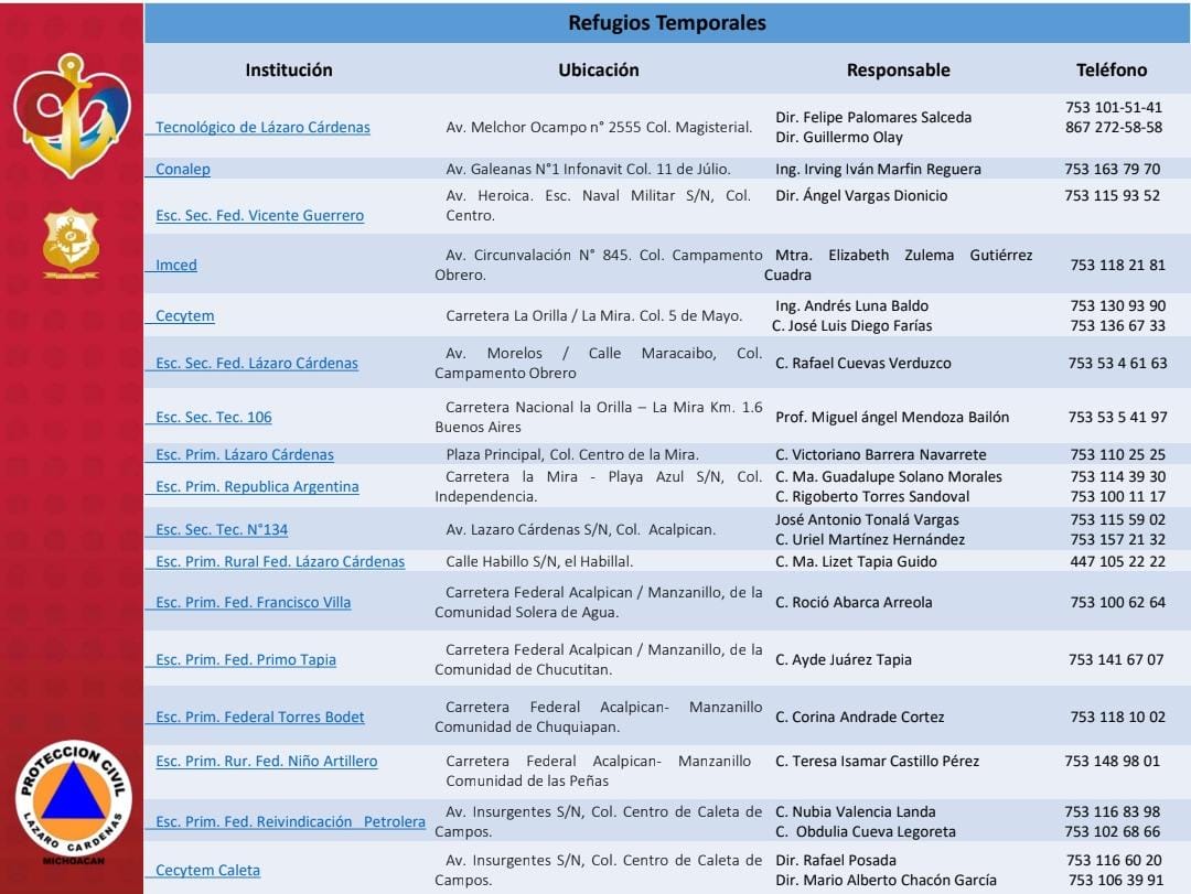 Asimismo, pone a disposición la lista de refugios temporales ubicados en diferentes puntos del municipio de Lázaro Cárdenas y sus tenencias. ¡Ante cualquier emergencia comunícate a los teléfonos de PCM que es 753-117-06-21!