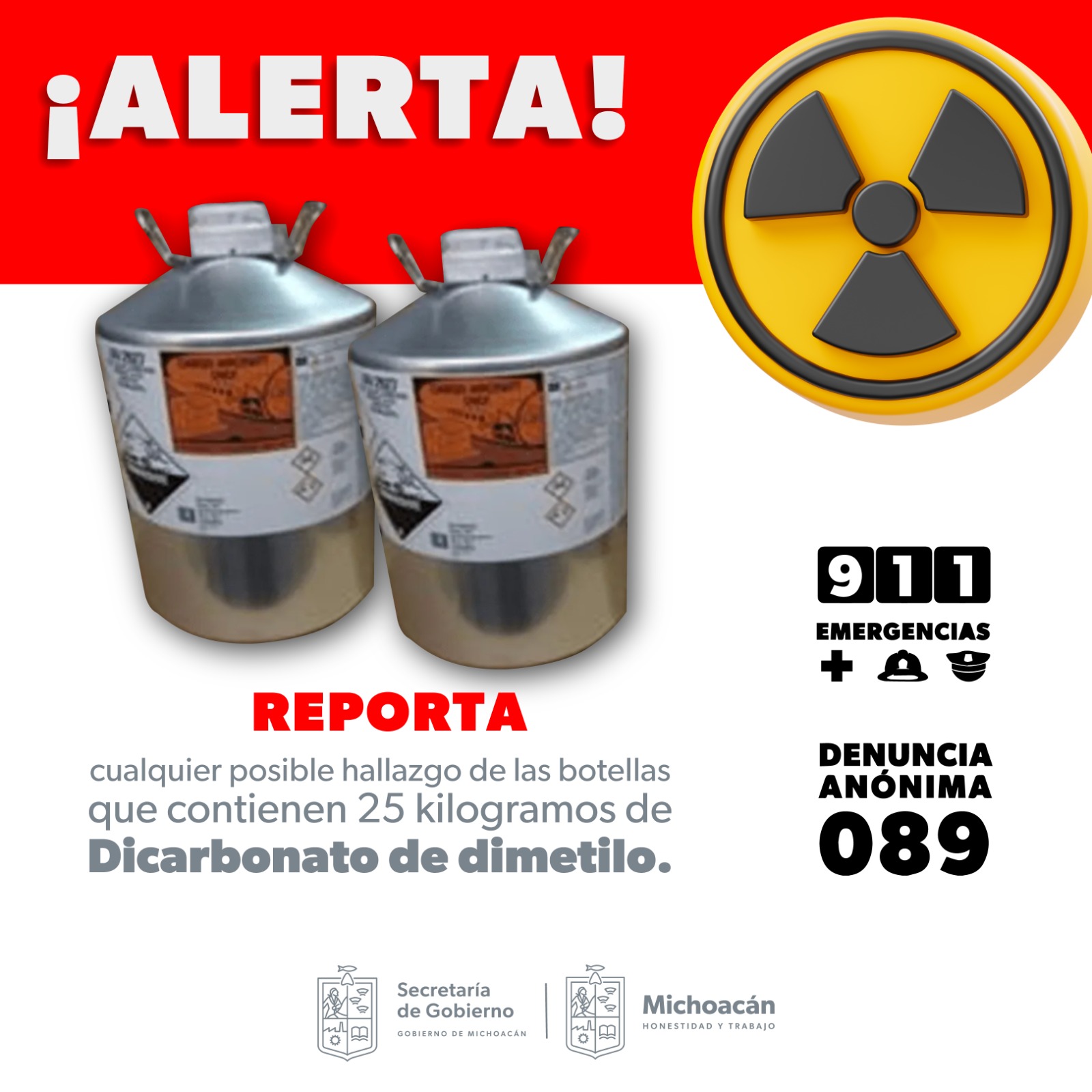 Morelia, Michoacán, 15 de enero de 2024.- El Gobierno de Michoacán, a través de la Coordinación Estatal de Protección Civil, pide a la población estar en alerta y reportar cualquier posible hallazgo de dos botellas que contienen 25 kilogramos de dicarbonato de dimetilo.