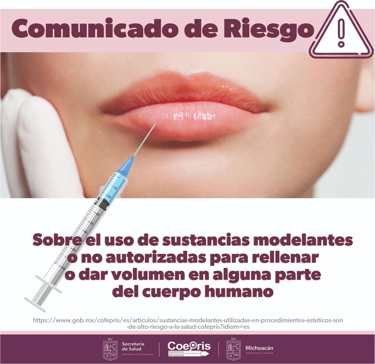Morelia, Michoacán a 08 de Septiembre de 2023.- La Comisión Federal para la Protección contra Riesgos Sanitarios (Cofepris), a través de la Secretaría de Salud de Michoacán (SSM), alerta a la población sobre los riesgos a la salud por la aplicación de sustancias modelantes no absorbibles o no biodegradables empleadas durante cirugías plásticas, estéticas y/o reconstructivas, en las que se busca modificar la apariencia corporal.