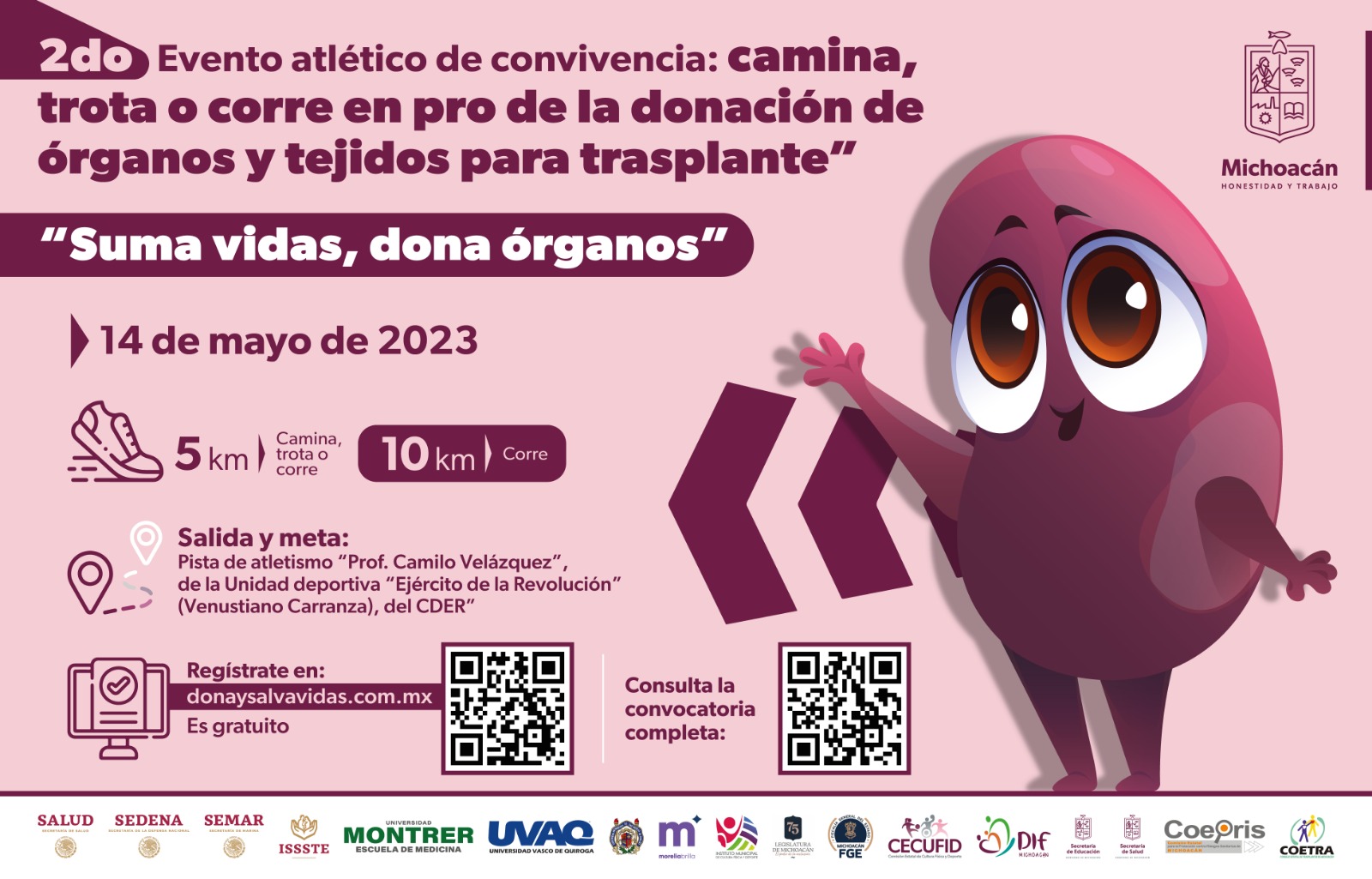 Morelia, Michoacán, 26 de abril de 2023.- Para concientizar a la población sobre la importancia que tiene la donación de órganos y tejidos, la Secretaría de Salud de Michoacán (SSM), a través del Consejo Estatal de Trasplantes (Coetra), realizará el domingo 14 de mayo, la segunda edición del evento atlético de convivencia Suma vidas, dona órganos.