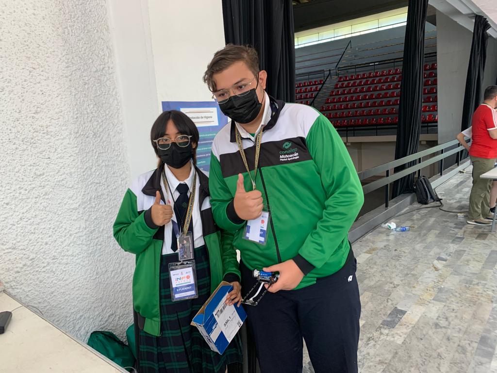 Morelia, Michoacán, 8 junio del 2022.- Tanaite Sarahi Ménera y Diego Esquivel Valencia, alumnos del Colegio de Educación Profesional Técnica del Estado de Michoacán (Conalep), plantel Apatzingán, obtuvieron la medalla de plata en su participación en Infomatrix World Finals 2022, que se realizó en la Universidad Autónoma de Guadalajara (UAG).