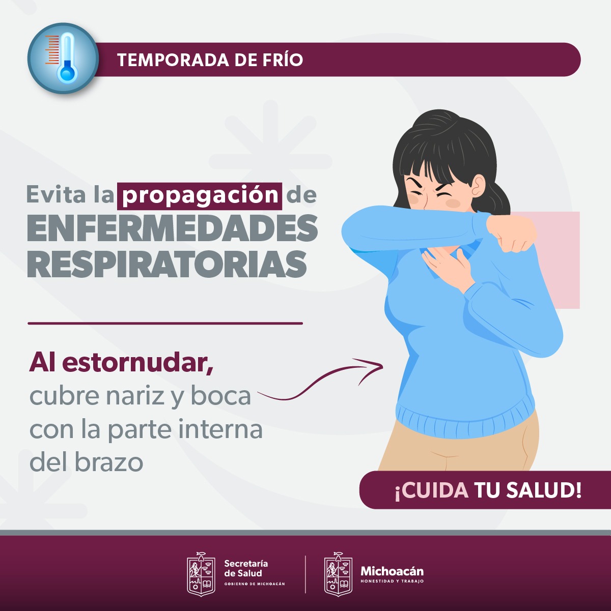 Morelia, Michoacán, a 29 de Octubre del 2023.- Derivado de las bajas temperaturas que empiezan a presentarse en la entidad, la Secretaría de Salud en Michoacán (SSM), refuerza las acciones de prevención y promoción en salud; así como la vigilancia epidemiológica, con el propósito de evitar incremento de enfermedades de las vías respiratorias en la población.