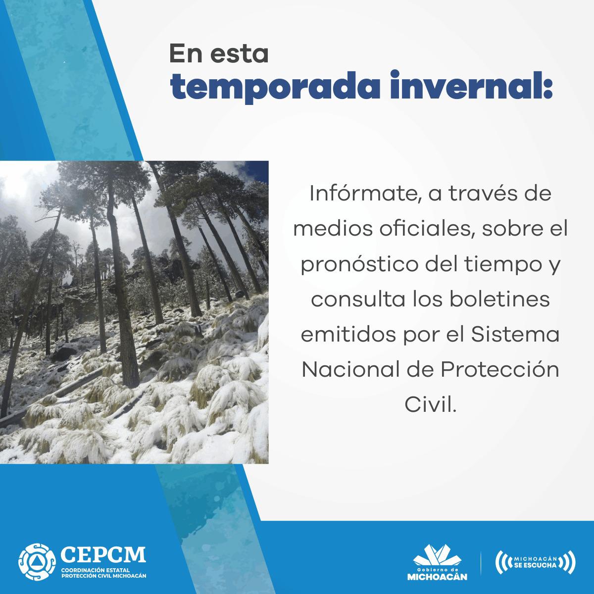 En este sentido, se pide a la ciudadanía michoacana no bajar la guardia en la prevención y contención de las temperaturas bajas, pues durante el día se espera cielo despejado y temperaturas cálidas, sin embargo, estas condiciones cambian de manera radical en la noche y en la madrugada.