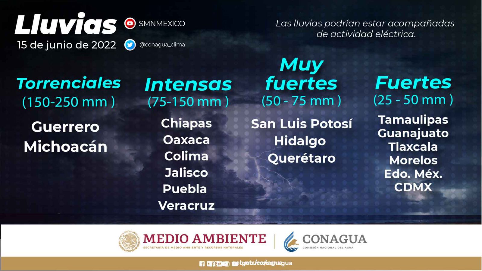 Según el pronóstico del Servicio Meteorológico Nacional, se presentarán en el transcurso de este miércoles, lluvias torrenciales (de 150 a 250 milímetros), debido a la cercanía de este fenómeno a las costas michoacanas, aproximadamente a 295 kilómetros al sur del Puerto de Lázaro Cárdenas.