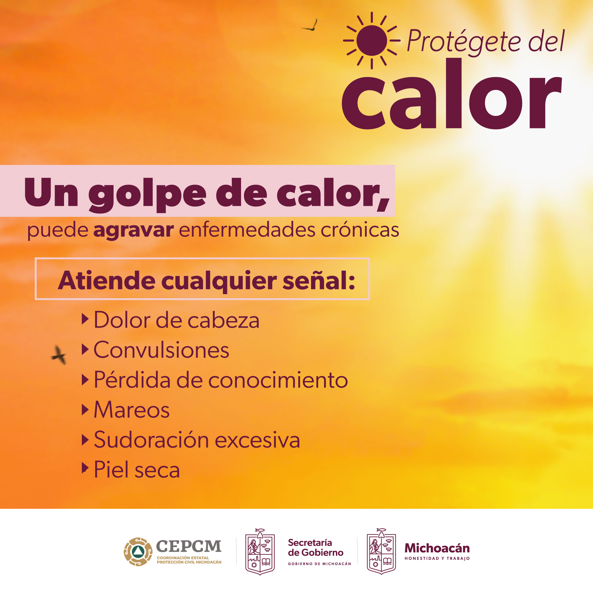 • No exponerse por tiempos prolongados al sol para evitar insolación y golpes de calor, en ese caso, utilizar bloqueador solar.