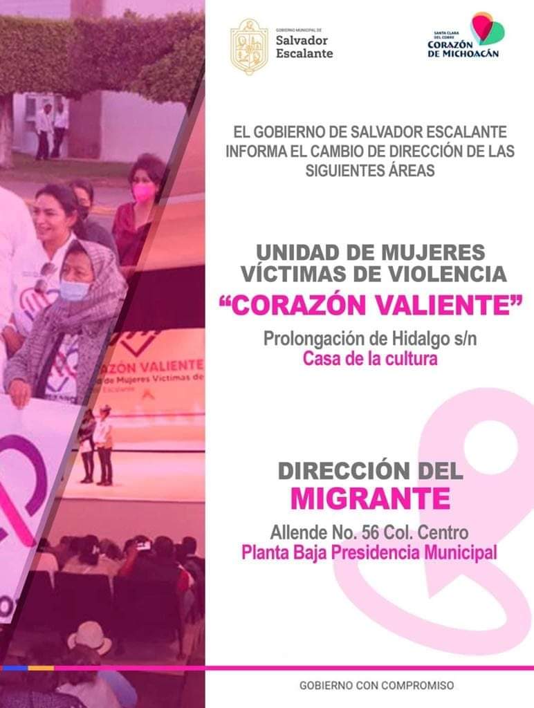 En ese sentido, anuncia a las y los usuarios de dichas áreas que la Dirección del Migrante se encuentra ubicada en la planta baja de la Presidencia Municipal, ubicada en calle Allende No. 56 del Centro Histórico de Santa Clara del Cobre.