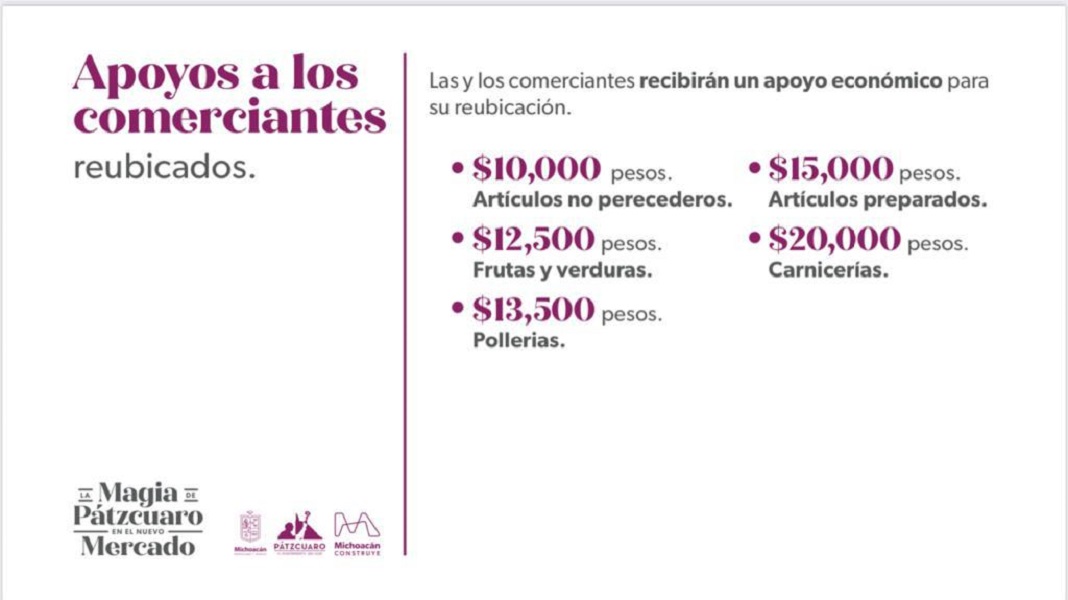 Morelia, Michoacán a 27 de Junio de 2023.- Para incentivar el traslado de los puestos hacia el nuevo mercado de Pátzcuaro, el Gobierno de Michoacán otorgará apoyos económicos a los comerciantes, informó el subsecretario de Gobernación, Juan Carlos Oseguera Cortés. El monto de los apoyos oscila entre los 10 mil y 20 mil pesos, según las necesidades de los distintos giros comerciales.«El gobernador Alfredo Ramírez Bedolla, ha instruido que se otorguen, a través de la Secretaría de Gobierno, apoyos a estos comerciantes», declaró el subsecretario.Algunos de los apoyos mencionados son los siguientes, de acuerdo a que tipo de tienda se tratan:– Artículos no perecederos: $10,000– Frutas y verduras: $12,500– Pollerías: $13,500– Alimentos preparados: $15,000– Carnicerías: $20,000Dentro del esquema de apoyos, serán considerados, únicamente, aquellos comercios que operen de forma regular, por lo que los puestos ambulantes no serán considerados. Oseguera Cortés, señaló que son 358 comerciantes los que se reubicarán hacia la plaza Gertrudis Bocanegra y las oficinas administrativas del ayuntamiento de Pátzcuaro, mismos que podrán acceder a estos incentivos económicos. El subsecretario finalizó su participación aclarando que «en las calles que albergan el comercio popular, Libertad, Codallos, Volador y Tanganxoan, estos comerciantes no serán reubicados y no podrán acceder a estos apoyos», concluyó.