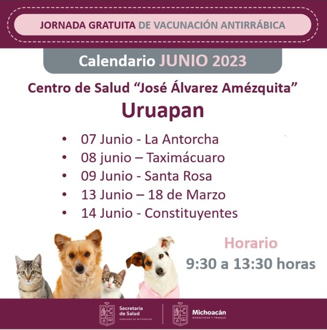 Uruapan, Michoacán, a 07 de junio de 2023.- La Secretaría de Salud de Michoacán (SSM) continúa con la campaña gratuita de vacunación antirrábica canina y felina en diferentes colonias del municipio de Uruapan.
