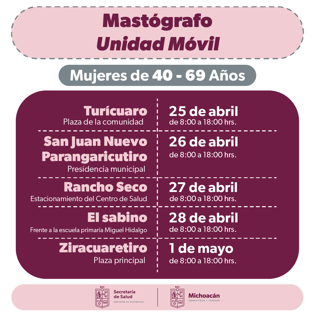 En Rancho Seco, localidad de Taretan, las mastografías se llevarán a cabo el jueves 27 de abril en el estacionamiento del centro de salud; mientras que el viernes 28 la unidad móvil brindará atención a mujeres de El Sabino, municipio de Uruapan.