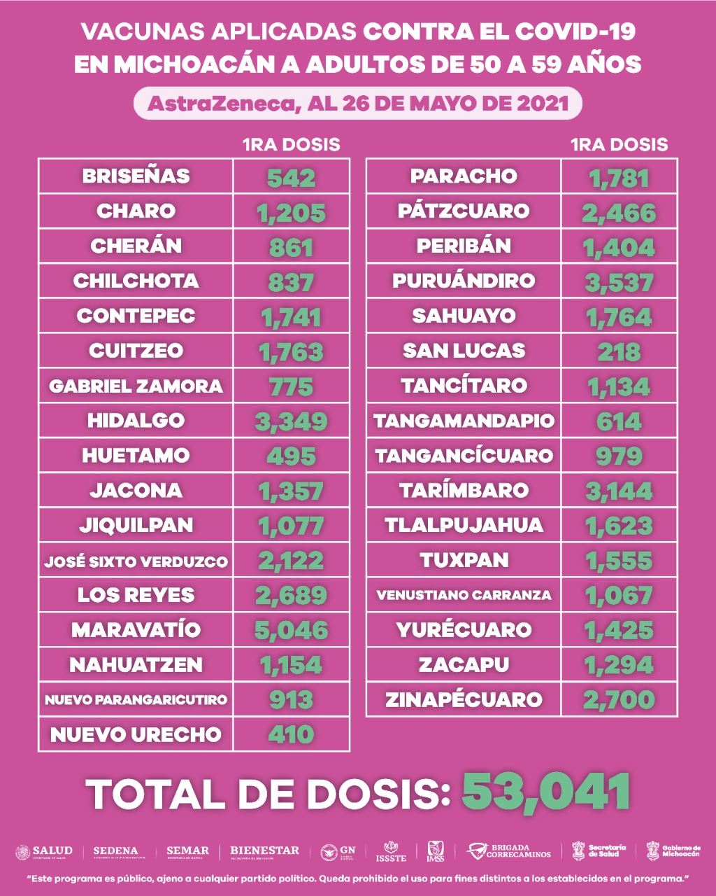 Morelia, Michoacán, a 26 de mayo de 2021.- En la entidad se han aplicado 204 mil 574 dosis de la vacuna anti-COVID-19 a personas de entre 50 y 59 años de edad, informó la Secretaría de Salud de Michoacán (SSM).
