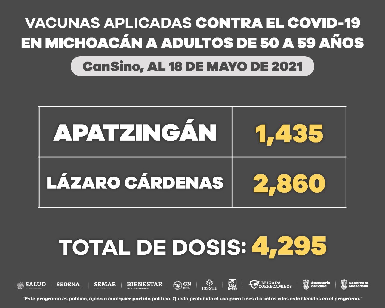 En Apatzingán (mil 435) y Lázaro Cárdenas (2 mil 860) se han aplicado 4 mil 295 dosis de CanSino, mientras que Morelia (10 mil 785), Uruapan (14 mil 125), Zamora (10 mil 375) y Zitácuaro (3 mil 101) suman 38 mil 386 dosis de Pfizer.