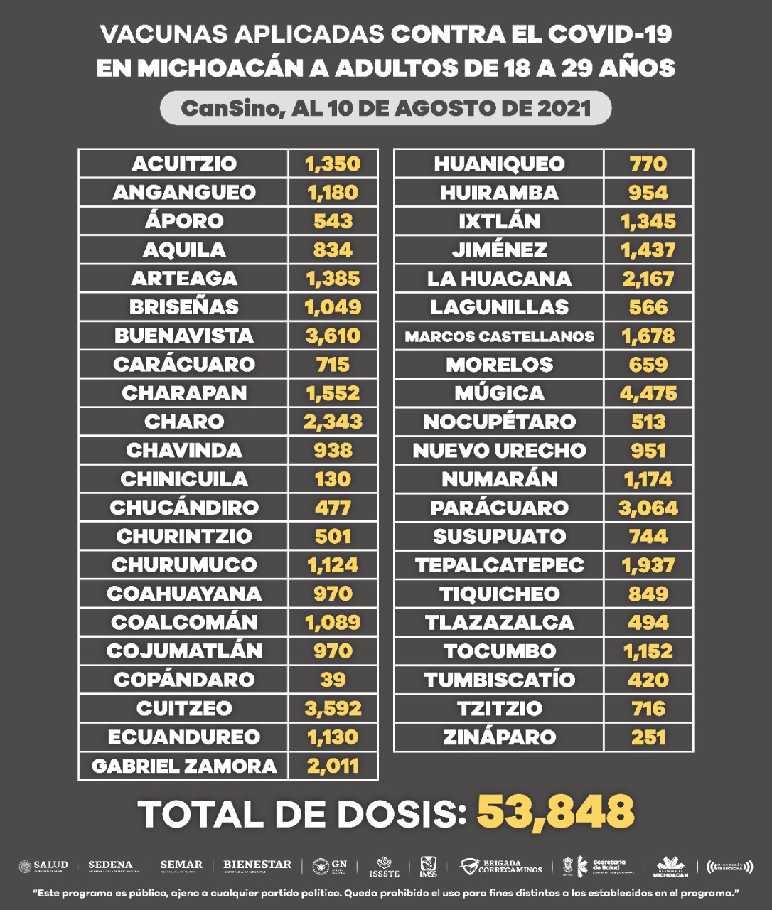 Morelia, Michoacán, a 10 de agosto de 2021.- La vacunación contra COVID-19 a personas de 18 a 29 años de edad, registra hasta la fecha una aplicación de 53 mil 848 dosis en varios municipios de la entidad, informa la Secretaría de Salud de Michoacán (SSM).