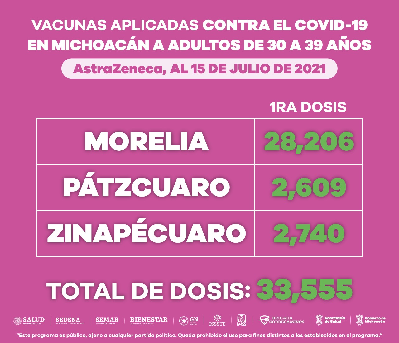 Morelia, Michoacán, a 15 de julio de 2021.- En la entidad, se han aplicado 88 mil 128 dosis de vacuna anti COVID-19, a población de 30 a 39 años de edad, informó la Secretaría de Salud de Michoacán (SSM).