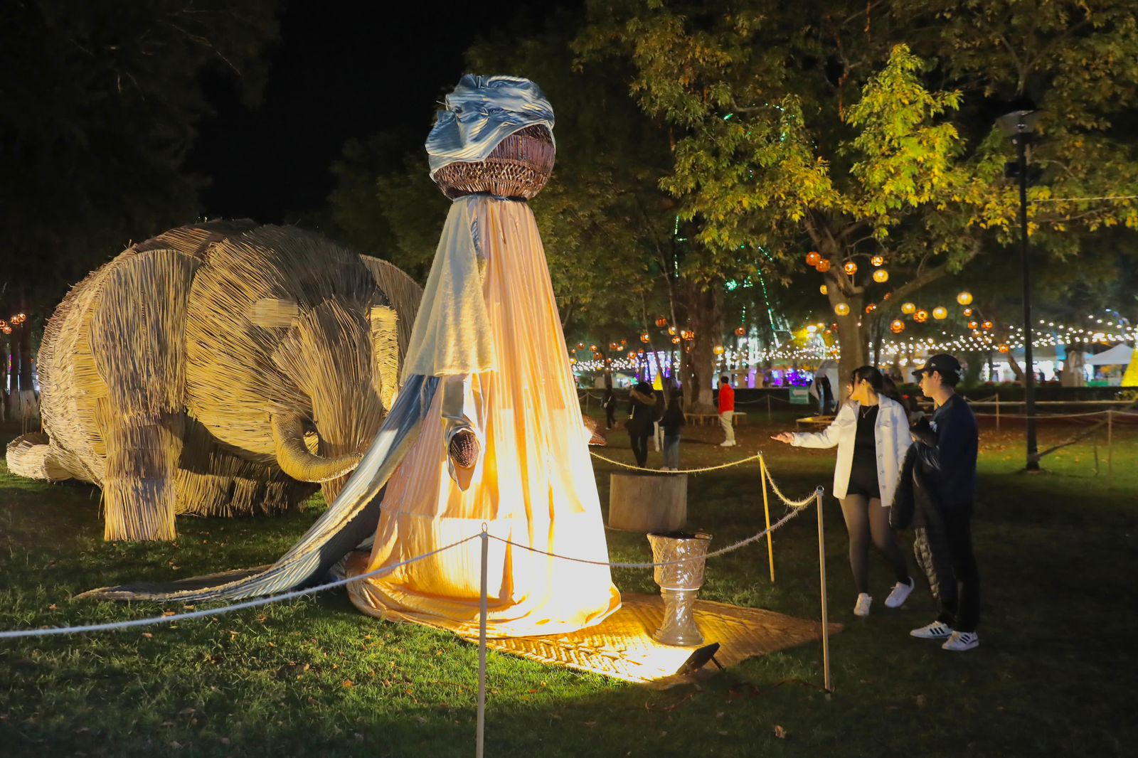 El nacimiento monumental, compuesto por Jesús, María y José, y los tres Reyes Magos, elaborados con túnicas hechas a mano, detalles de madera tallada, tejido de chúspata y elementos de cobre, presume la destreza y magia de las manos artesanas con figuras que alcanzan los cinco metros de altura.