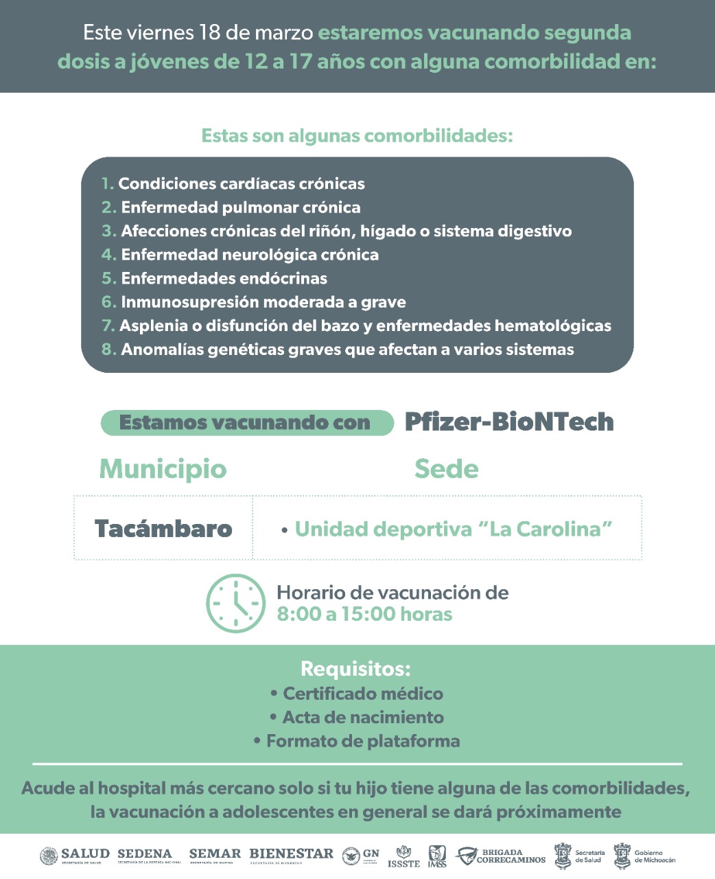 Morelia, Michoacán, a 18 de marzo del 2022.- Arranca la aplicación de segunda dosis de vacuna anti COVID-19, para adolescentes de 14 a 17 años y a comórbidos de 12 a 17 años del municipio de Tacámbaro.