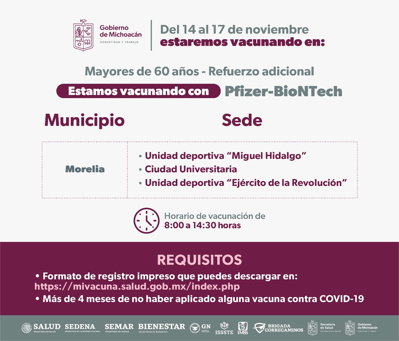 Morelia, Michoacán, 10 de noviembre del 2022.- La Secretaría de Salud de Michoacán (SSM) informa a la población que del 14 al 17 de noviembre arrancará en Morelia una nueva jornada para aplicar el refuerzo contra el COVID-19 a todos los mayores de 60 años. Para ello se instalarán módulos de vacunación en el Colegio de Morelia “Poliforum”, Ciudad Universitaria, unidad deportiva “Ejército de la Revolución”, mejor conocido como el Venustiano y unidad deportiva “Miguel Hidalgo”.