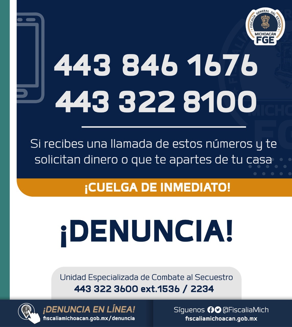 La FGE solicita a la población a no atender este tipo de llamadas, y denunciarlas de forma inmediata ante la Fiscalía Regional más cercana, o bien a la Unidad Especializada de Combate al Secuestro, ubicada en Periférico Independencia #5000, colonia Sentimientos de la Nación en Morelia, o comunicarse al teléfono 443 322 36 00 extensión 2234.