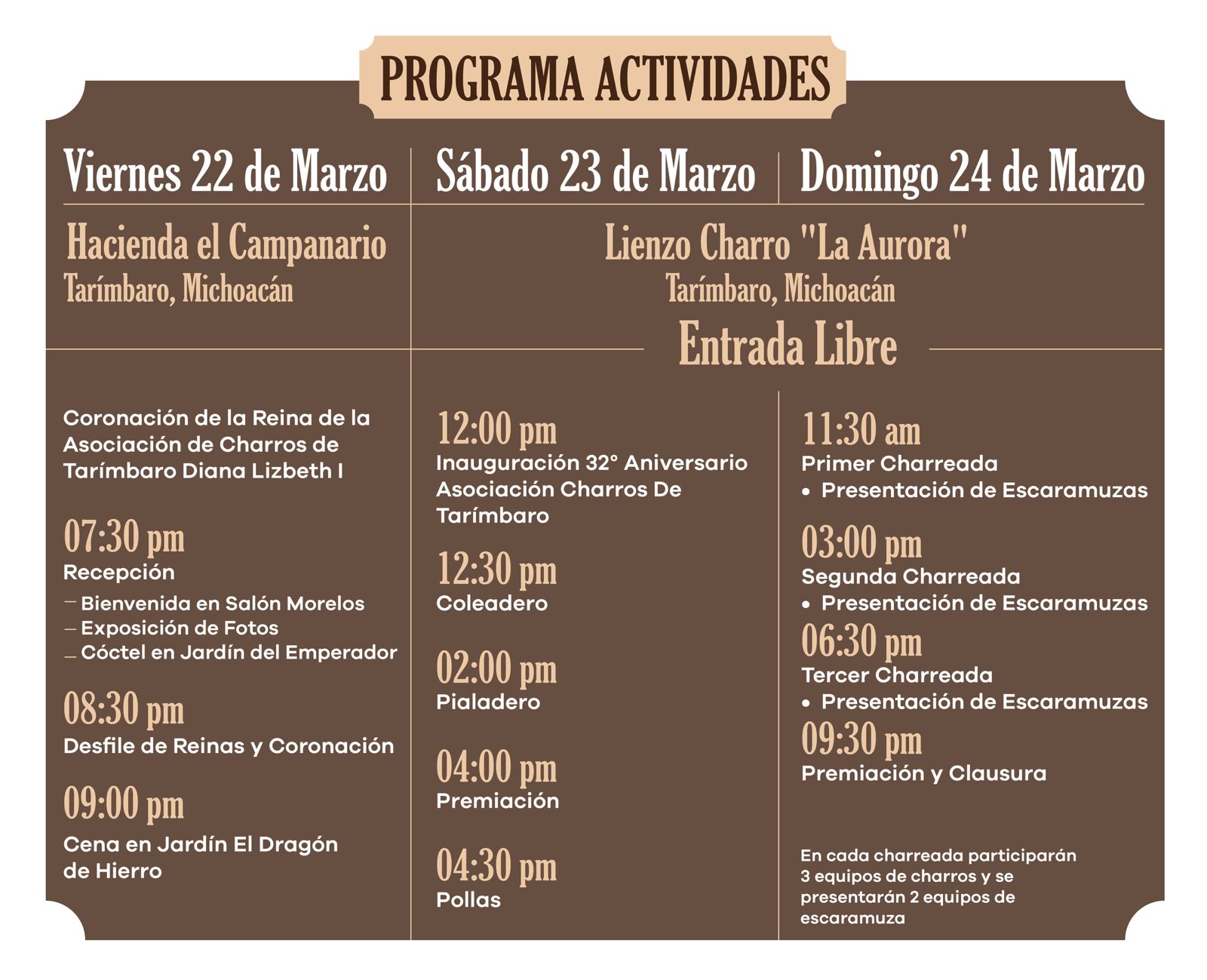Para el sábado 23 de marzo, comentó Apoloneo Ibarra, uno de los organizadores, se efectuará la inauguración del torneo del 32 aniversario de la Asociación de Charros de Tarímbaro, en el lienzo charro La Aurora, con entrada libre a partir de las 12 del día. “La mujer es el alma de la charreada y es muy importante su presencia como escaramuza, pues dan mucha vista y atraen al público”, consideró.
