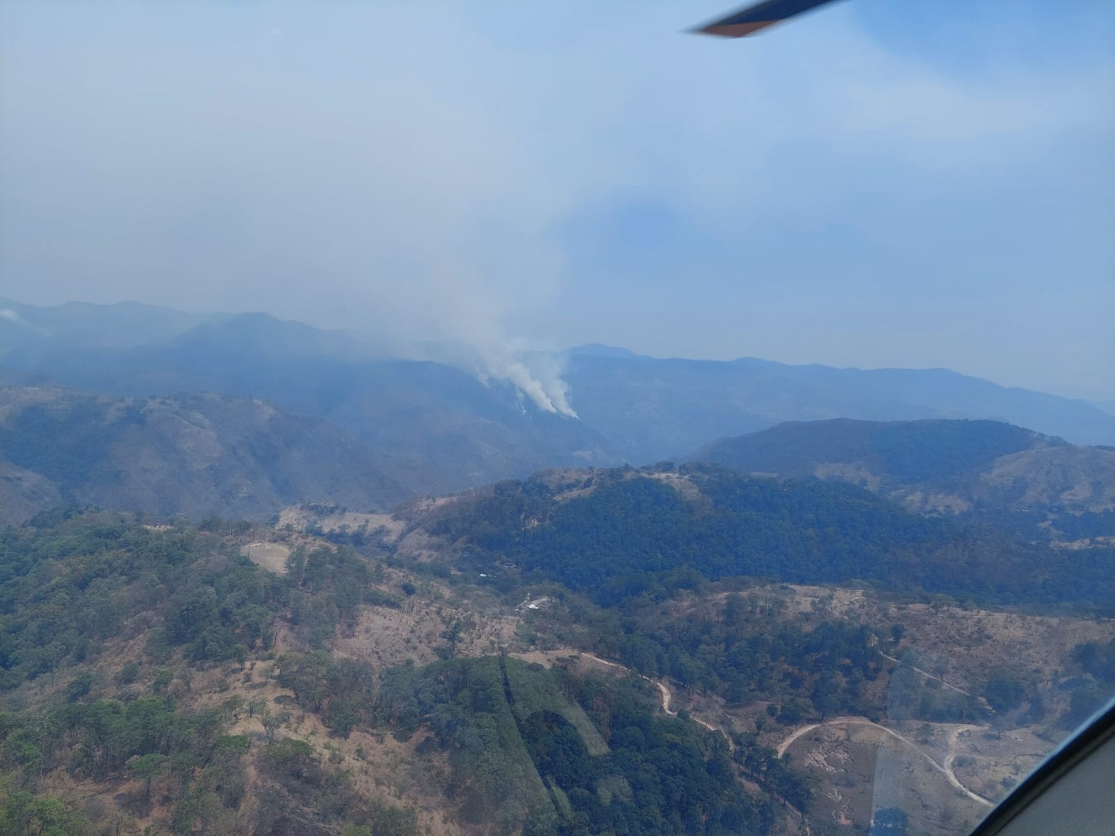 Por tierra participan tres brigadas de la Comisión Nacional Forestal (Conafor), Cofom y el ayuntamiento, así como voluntarios en el control de las llamas.