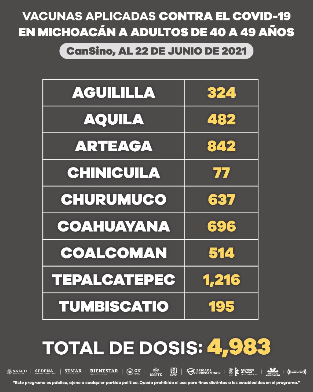 Del total del biológico aplicado 4 mil 983 dosis fueron de la farmacéutica CanSino, en beneficio de habitantes de Aguililla, Aquila, Arteaga, Chinicuila, Churumuco, Coahuayana, Coalcomán, Tepalcatepec y Tumbiscatío.