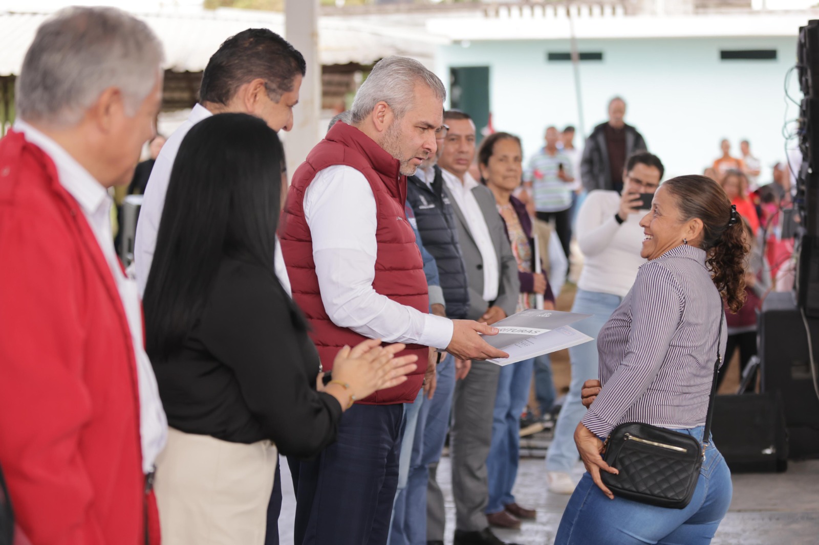 Uruapan, Michoacán, 4 de diciembre de 2023.- El gobernador Alfredo Ramírez Bedolla, entregó 300 escrituras de propiedad a habitantes de la colonia Clara Córdova Morán, del municipio de Uruapan.