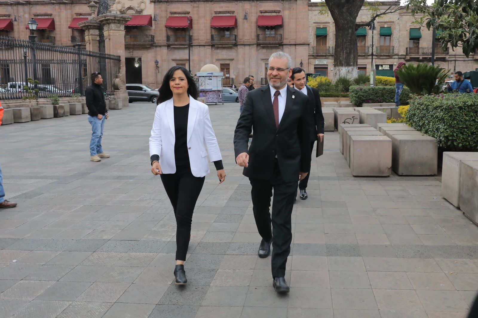 Participaron en el acto el secretario de Gobierno, Elías Ibarra Torres; la diputada presidenta de la comisión de Cultura y Artes del Congreso local, Andrea Villanueva Cano; el magistrado presidente del Supremo Tribunal de Justicia del Estado, Jorge Reséndiz García; la rectora de la Universidad Michoacán de San Nicolás Hidalgo, Yarabí Ávila González; y el comandante de la XXI Zona Militar, Fernando Colchado Gómez; así como autoridades municipales.