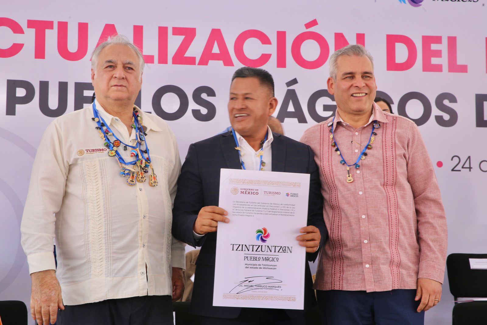 Paracho, Michoacán a 24 de Abril de 2023.- El gobernador Alfredo Ramírez Bedolla y el secretario federal de Turismo, Miguel Torruco Marqués, entregaron a nueve presidentes municipales de Michoacán la actualización de nombramiento de Pueblo Mágico para Paracho, Pátzcuaro, Santa Clara del Cobre, Tzintzuntzan, Tacámbaro, Jiquilpan, Cuitzeo, Angangueo y Tlalpujahua.