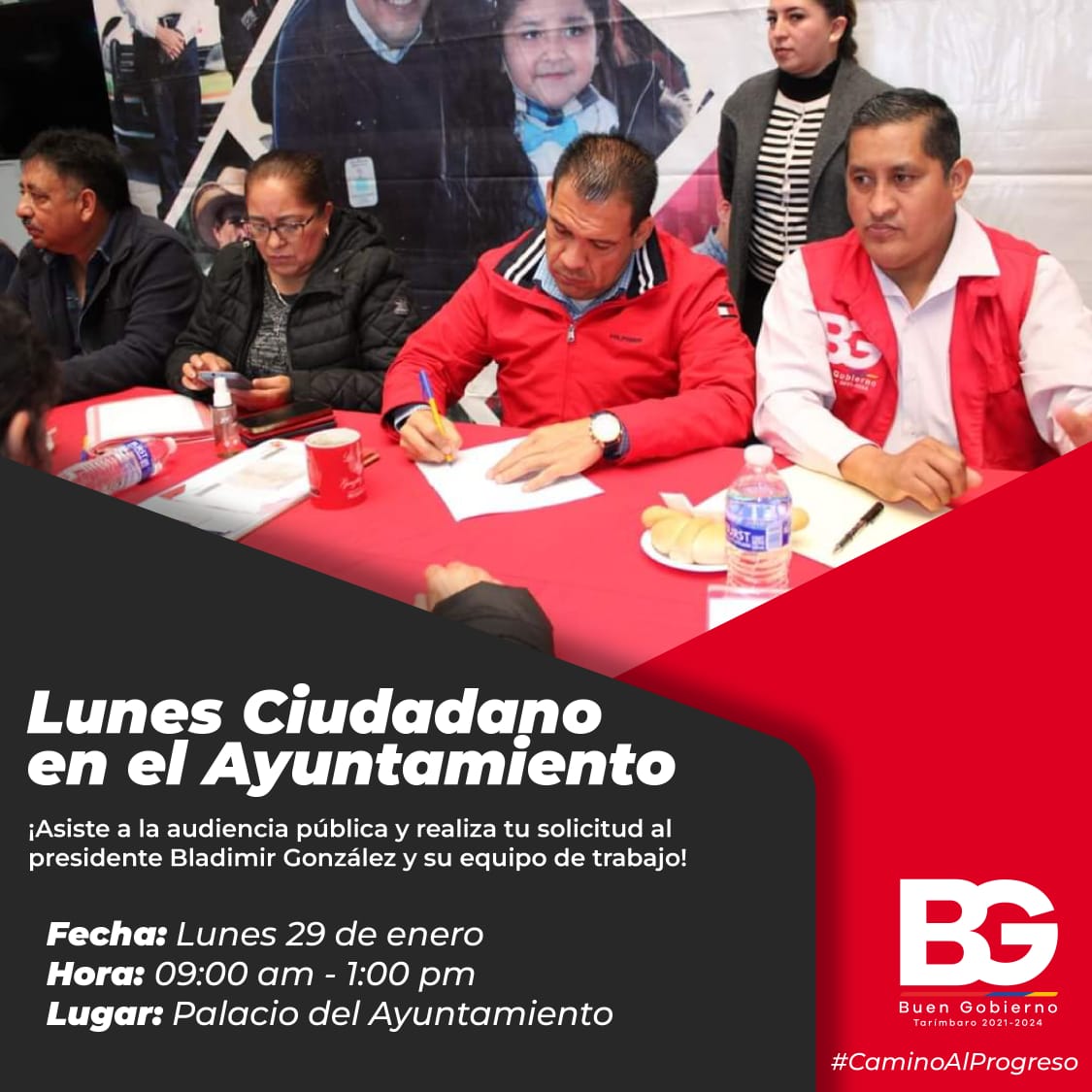 Tarímbaro, Michoacán, a 27 de Enero de 2024.- El Buen Gobierno de Tarímbaro, liderado por el presidente Bladimir González, se complace en invitar al Lunes Ciudadano, que se llevará a cabo el próximo 29 de enero en las instalaciones del Palacio Municipal.