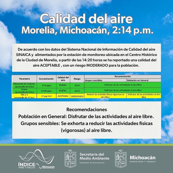 Morelia, Michoacán a 21 de Mayo de 2023.- De acuerdo con datos que arroja la estación de monitoreo de la calidad del aire en el centro de Morelia, misma que depende de la Secretaría de Medio Ambiente (Secma) del Gobierno de Michoacán, se informa que los parámetros de contaminantes se mantienen bajos y hay condiciones aceptables para realizar actividades al aire libre.