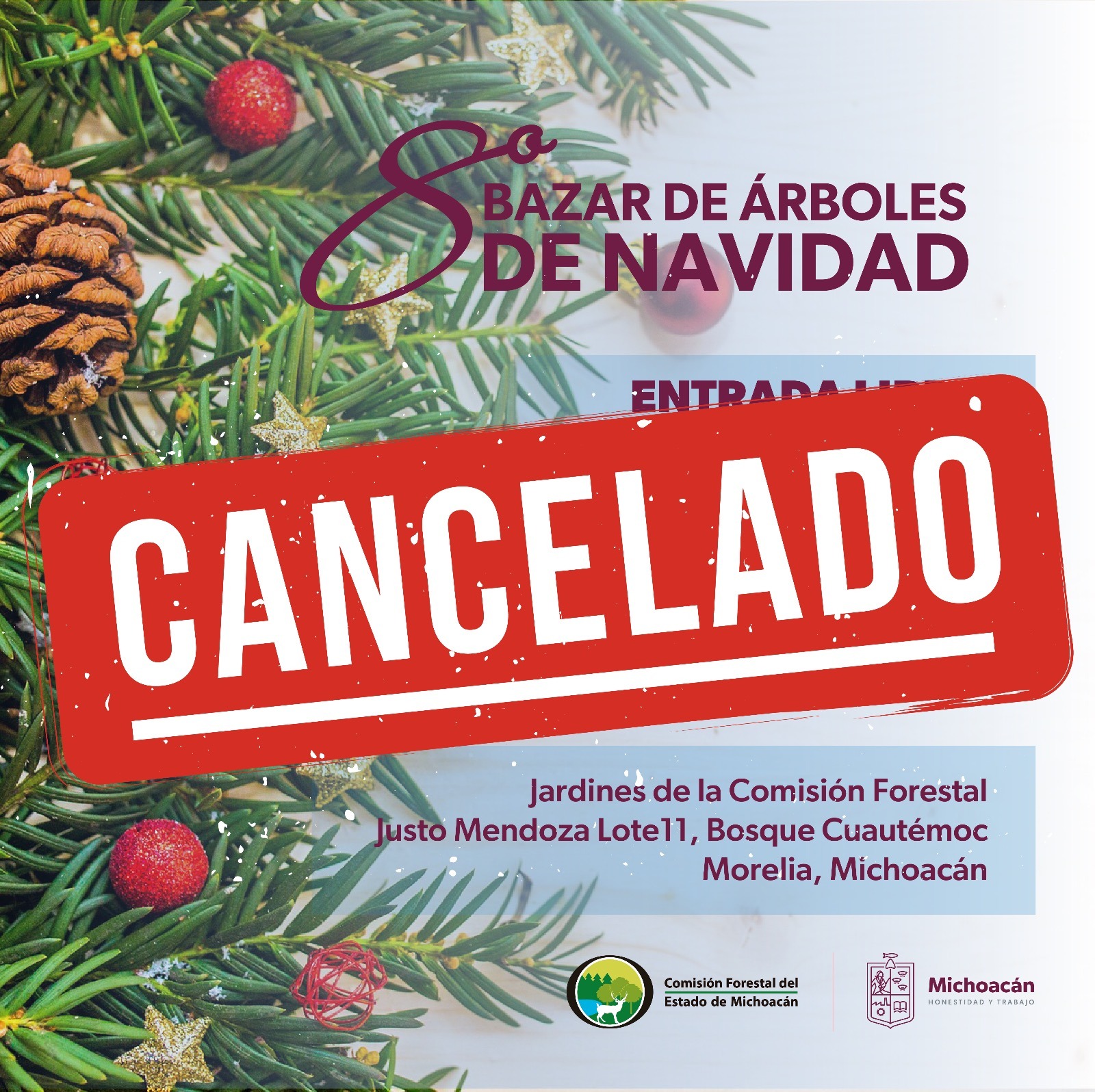 Morelia, Michoacán a 29 de noviembre de 2023.- Derivado de la toma de las instalaciones de la Comisión Forestal de Michoacán (Cofom), su director general, Rosendo Antonio Caro Gómez, informó que se cancela la octava edición del Bazar de Árboles de Navidad, programada del 1 al 3 de diciembre de 2023.
