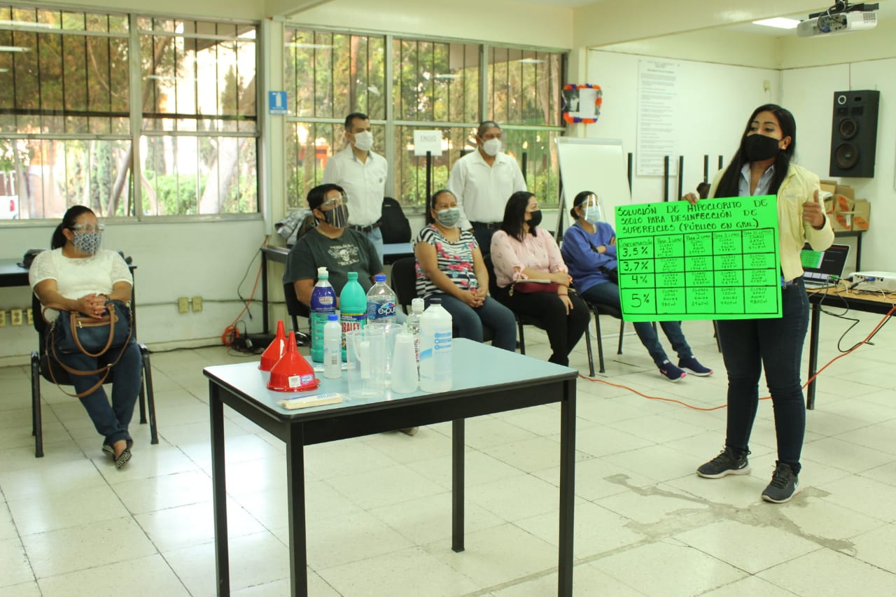 Es así que en la Escuela Secundaria Federal No. 4 se dio inicio a dicho entrenamiento, durante el cual se les explicó a las y los integrantes que conforman el Comité de Participación Escolar en Salud, sobre la elaboración de agua clorada, los pasos para la fabricación casera de soluciones desinfectantes, el establecimiento de filtros sanitarios y otros recursos para garantizar espacios educativos más seguros.