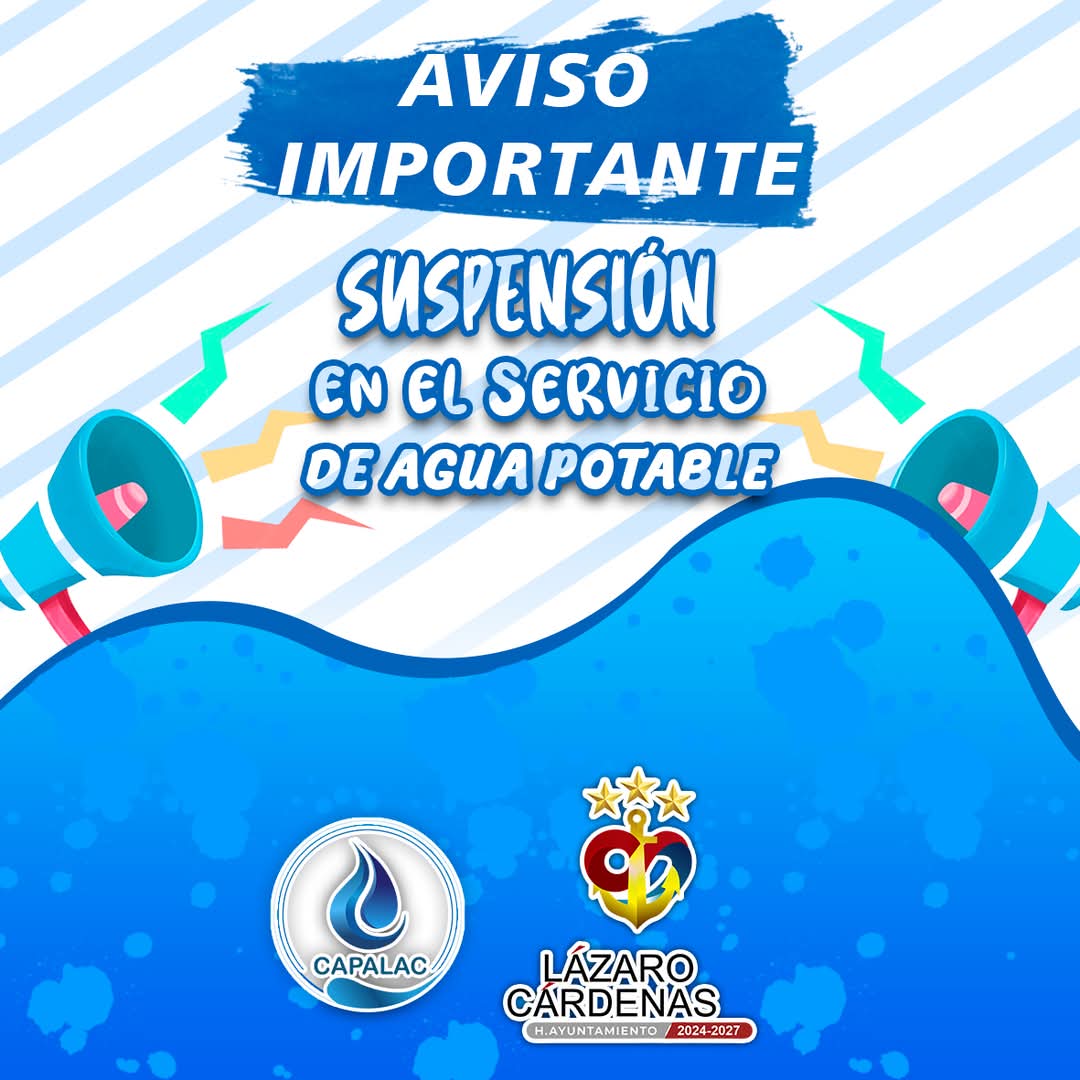 Cd. Lázaro Cárdenas, Michoacàn a 14 de Enero del 2024.-El Comité de Agua Potable y Alcantarillado de Lázaro Cárdenas informa a la población que a partir de mañana miércoles se tendrá la suspensión del servicio de agua, el cual se reanudará el día viernes 17 de enero; ya que durante estos días se realizara el cierre de la compuerta del Distrito Industrial Marítimo (DIM) para el cambio de la válvula de 24”, asimismo se limpiara los tanques reguladores y cisterna en la planta potabilizadora