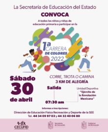 Morelia, Michoacán, 22 de abril de 2022.- La Secretaría de Educación del Estado (SEE) invita a todos los alumnos de nivel primaria a correr, trotar o caminar en la Primera Carrera de Colores. En el marco de las actividades por el Día del Niño y la Niña, el...