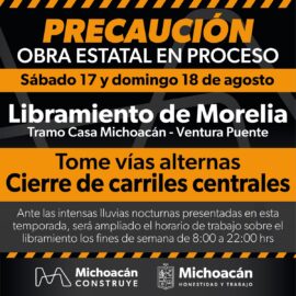 Morelia, Michoacán a 17 de Agosto de 2024. La Secretaría de Comunicaciones y Obras Públicas (SCOP) informa el desarrollo trabajos de reencarpetamiento en el libramiento de Morelia los días sábado 17 y domingo 18 de agosto, de 8:00 a 22:00 horas, sobre carriles centrales. Los trabajos de la...