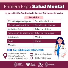 Lázaro Cárdenas, Michoacán, 9 de Agosto de 2024.- La Secretaría de Salud de Michoacán (SSM) ofrecerá consultas psicológicas gratuitas, talleres de prevención del suicidio, arteterapia y yoga, en la primera Expo Salud Mental en Lázaro Cárdenas, mañana sábado 10 de agosto, en el parque Jesús Romero Flores. De...