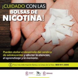 Morelia, Michoacán, 8 de agosto de 2024.- La Comisión Nacional de Salud Mental y Adicciones (Conasama), a través de la Secretaría de Salud de Michoacán (SSM), advierte a la población sobre los riesgos del uso de bolsas de nicotina, ya que son altamente adictivas y dañinas para el...