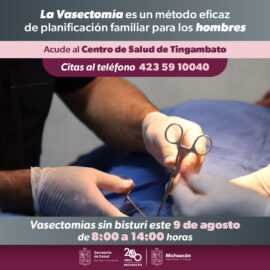 Morelia, Michoacán, 6 de Agosto de 2024.- Todos los hombres de Tingambato mayores de 18 años que no deseen tener más hijos y busquen un método anticonceptivo permanente, podrán realizarse una vasectomía sin bisturí gratuita en la jornada que hará la Secretaría de Salud de Michoacán (SSM) el...