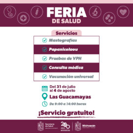 Lázaro Cárdenas, Michoacán, 30 de Julio de 2024.- La Secretaría de Salud de Michoacán (SSM) llevará servicios de salud gratuitos, consultas y análisis de laboratorio, a toda la población de la tenencia Las Guacamayas, en Lázaro Cárdenas, del 31 de julio al 4 de agosto. Se podrán solicitar...