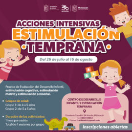 Morelia, Michoacán, 12 de Julio de 2024.- La Secretaría de Salud de Michoacán (SSM) informa a la población que siguen abiertas las inscripciones para la Jornada de Acciones Intensivas de Estimulación Temprana, en la que niñas y niños de 4 a 6 años podrán desarrollar habilidades motrices y...