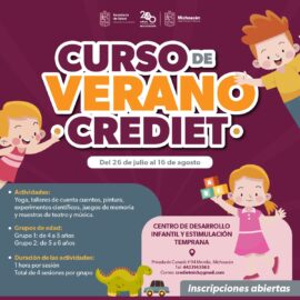 Morelia, Michoacán, 5 de Julio de 2024.- Para promover el desarrollo físico, emocional y creativo de niñas y niños, la Secretaría de Salud de Michoacán (SSM) invita al curso de verano gratuito en el Centro Regional de Desarrollo Infantil y Estimulación Temprana (Crediet) de Morelia, del 26 de...