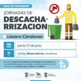Morelia, Michoacán, 23 de junio 2024.- A partir del 27 de junio arranca en el municipio de Lázaro Cárdenas la jornada de descacharrización, como parte de la estrategia implementada por la Secretaria de Salud de Michoacán (SSM), para el combate contra el dengue. Está acción encabezada por...