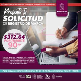 Morelia, Michoacán, 17 de Junio de 2024.- A partir de este lunes 17 de junio y hasta el próximo 16 de julio del presente año podrás acceder a un 90 por ciento de descuento sobre el trámite de registro de marca, aviso o nombre comercial ante el Instituto...
