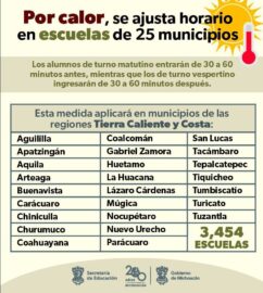 Morelia, Michoacán a 22 de Abril de 2024. Este lunes inicia el ajuste de horario en más de 3 mil 400 escuelas en 25 municipios de Michoacán debido a las altas temperaturas que se han registrado esta temporada, informó la Secretaría de Educación del Estado (SEE). La...