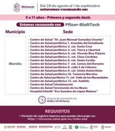 Morelia, Michoacán a 30 de Agosto de 2023.- Para proteger a los 60 mil menores de 5 a 11 años que se estima no han sido vacunados contra el COVID-19 en la entidad, la Secretaría de Salud de Michoacán (SSM) reforzará las acciones de inmunización a este grupo...