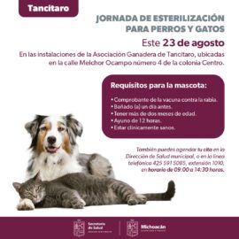 Morelia, Michoacán a 21 de Agosto de 2023.- Para controlar la reproducción de animales domésticos, la Secretaría de Salud de Michoacán (SSM) y el Ayuntamiento de Tancítaro, llevarán a cabo una jornada gratuita de esterilización canina y felina el próximo miércoles 23 de agosto. Las cirugías se realizarán...
