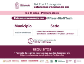 Morelia, Michoacán, a 20 de Agosto del 2023.- La Secretaría de Salud de Michoacán (SSM), mantendrá vacunación anti COVID-19 para menores de 5 a 11 años en 8 municipios, donde se estarán aplicando primeras y segundas dosis de Pfizer-BioNTech. Es así, que del 20 al 25 de agosto...